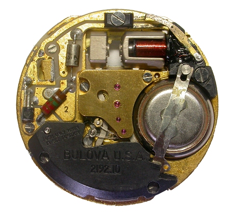 The 219 is a very interesting version of the Accutron, being derived directly from the 218. Some say it was designed by the Citizen Watch Co. (who were building 218's for Bulova). It has Bulova USA on the movement, but there's no reason to believe that at least some parts didn't come from Citizen. This movement is clearly designed for maximum economy of production. You will notice that it has only one drive coil. The other side of the tuning fork is simply a mass to balance the fork. The single coil also contains the feedback winding. The circuit components are mounted on a fibreglass circuit board and have been spread out over a large area (for greater ease of manufacture). The jewel bearings, previously little "chatons" with endstones have been replaced by single press fitted jewels. This reduced the jewel count of 13 in the 218 to 7 in this movement. Surface finishing was limited to only where it was required for functionality, which would have helped in reducing the cost of production of these movements. They dispensed with one coil, simplified the manufacture of the electronics, simplified the jewelling, simplified the train bridge, simplified the train wheels by removing the need for accurate length control, and at the same time could still use the 218 production line to make the parts. In fact, many of the parts used were from the 218, especially day/date parts.The Model 2190, listed in their Technical Data Sheet, was never manufactured, only the 2191, 2192 and 2193. The 219 works just as well as the 218, and is very collectible.