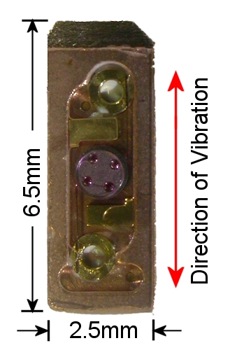 Without any doubt, this calibre is the most unusual Tuning Fork watch ever made. Its principle of operation is quite different (and yet quite similar) to other tuning fork watches. Like the Accutron 214 and the Swissonic watches (ie the ESA 9162 and 9164) this movement was also designed by Max Hetzel, who left Bulova a number of years previously. This design enabled Omega to bypass any patents held by Bulova. Unlike other tuning fork watches, it does not have an index finger attached to the fork and a pawl finger attached to the watch plate. In fact it does not actually even have index and pawl fingers as such, but two "clicks", each of which act as both an index and pawl finger. The index wheel is different also, as it does not have an axle, pinion, or pivots, but runs on 4 balls, sandwiched between 2 ruby discs, mounted in a small hermetically sealed casing called the Micromotor. The Micromotor assembly is mounted on the smaller tine of the tuning fork. It is not serviceable, and requires no adjustment. The Micromotor, at only 0.6 mm thick, stands out as being one of the smallest watch assemblies ever made. I think this would be true even today. See pics below: