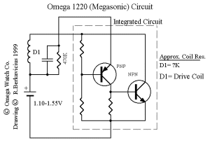 Not only did Omega get around Bulova's tuning fork patent with this watch, they also developed an electronic circuit different to all other Tuning Fork watches as well. The Omega 1220 did not use a feedback coil, as can be seen from the circuit. Up until now, all tuning fork watches had a feedback coil. This includes the Bulova 230 series watches, which have a similar looking coil shaped like a flat disk, but which in fact contains a feedback coil.