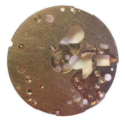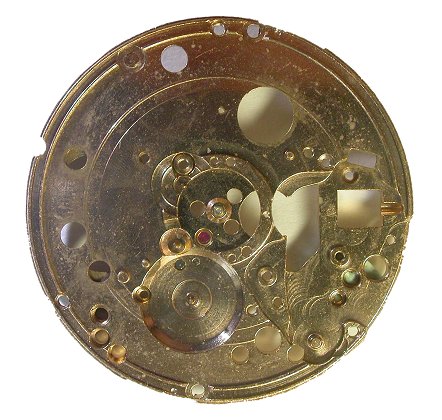 The chronograph mechanism is in modular form (refer to the Esa 9162 and 9164), and mounts on the dial side of the movement. Being of a Vertical Clutch design, it doesn't suffer from the inaccurate start/stop problems of standard sliding-clutch chronographs, It contains the gear train for the chrono mechanism, the chrono mechanism itself, and a train for driving the hands and date mechanism. Also, it has the day and date functions built into it, as well as the time and chrono functions. The Chronograph trains and constant seconds are driven by the Intermediate Wheel, which passes through the pillar plate and has its upper bearing in the chrono module. The time and date trains are driven by the Friction Wheel, which also passes through the pillar plate and has its upper bearing in the chrono module. See drawings below.