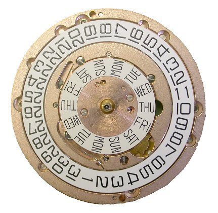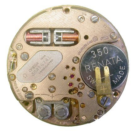 And if you think there are lots of gears in the back of the chrono module, there are just about as many on the dial side. In total, there are 19 gears in the chrono module, more than in most watches complete! One of the clever tricks was to get the continuos seconds and the time/date train independant of the function of the chronograph. Also, since a tuning fork mechansim is designed for a more-or-less constant load, the chronograph was required to operate under constant load conditions. Hence when the chrono is functioning, the minute and hour hands move smoothly, like the small seconds and Chronograph hand. Omega extend this argument to the calendar, and say that is the reason why and the day and date changes smoothly. Actually, they simply could not have any "jumping" type date mechanisms in it, as they simply did not have the room to include one.